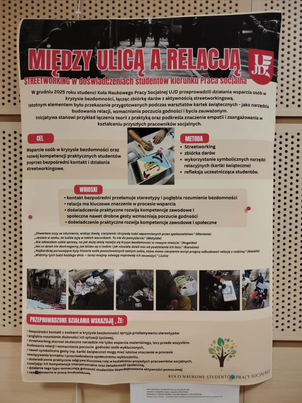 Podczas konferencji, członkowie Koła Naukowego Studentów Pracy Socjalnej zaprezentowali również poster pt. „Między ulicą a relacją – streetworking w doświadczeniu studentów kierunku Praca socjalna UJD”. Praca ta stanowiła cenne dopełnienie części naukowej, ukazując praktyczny i relacyjny wymiar działań streetworkerskich.