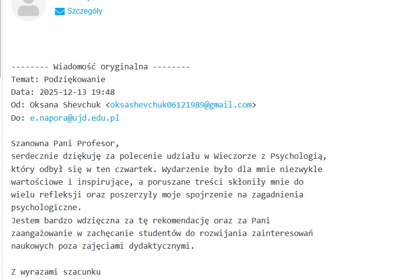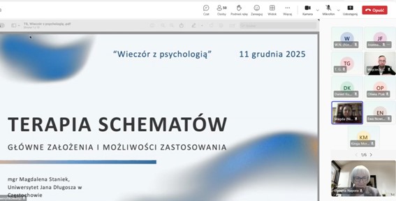 Sympozjum Naukowe "Wieczór z Psychologią #11" pt. Konteksty psychoterapii w formie on-line, odbyło się 11 grudnia 2025 roku. Wydarzenie naukowe zgromadziło wiernych uczestników w osobach, władz dziekańskich, studentów nie tylko psychologii, pracowników naukowych także z Uniwersytetu Jana Długosza. Zaproszenie do udziału przyjęli prelegenci: psychologowie psychoterapeuci, praktycy zawodowi, specjaliści w dyscyplinie psychologia.