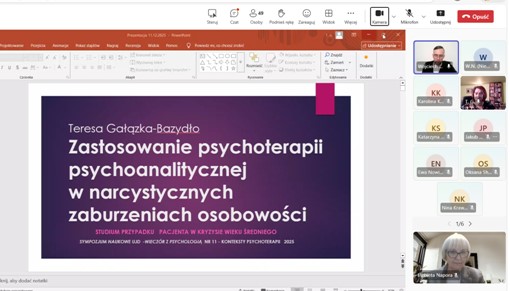 - Mgr Teresa Gałązka - Bazydło, (Ośrodek Psychoterapii i Psychologii Klinicznej Medzyrzecz, Ośrodek Psychoterapii i Myśli Psychoanalitycznej, Poznań), Psychoterapia psychoanalityczna wobec współczesnych problemów klinicznych. Zastosowanie psychoterapii psychoanalitycznej w narcystycznych zaburzeniach osobowości - studium przypadku pacjenta w kryzysie wieku średniego