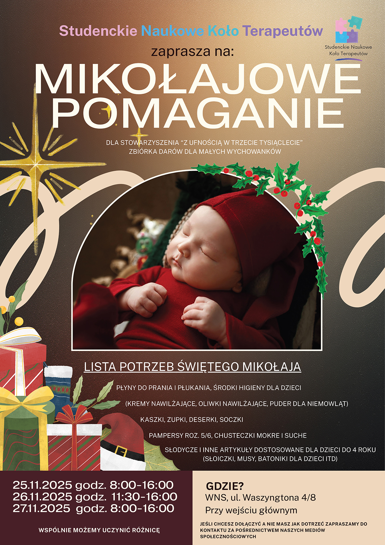 Studenckie Naukowe Koło Terapeutów zaprasza do udziału w zbiórce darów Świętego Mikołaja dla podopiecznych Stowarzyszenia „Z Ufnością W Trzecie Tysiąclecie”.