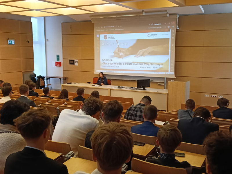 Tegorocznym tematem zmiennym Olimpiady jest "Służba publiczna", dlatego poza rywalizacją olimpijską uczniowie wzięli udział w prelekcji przygotowanej specjalnie na tę okazję przez Komendę Miejską Policji w Częstochowie, reprezentowaną przez asp. Marlenę Leszczyniak i mł. asp. Mariusza Klekota oraz Placówkę Straży Granicznej w Częstochowie, reprezentowaną przez Komendanta PSG w Częstochowie ppłk SG Przemysława Starczewskiego. Uczniowie w ramach tego spotkania mogli dowiedzieć się z jakimi wyzwaniami mierzą się obecnie służby mundurowe i jakie elementy ich pracy stanowią o tym, iż jest to "służba publiczna". Naszym gościom serdecznie dziękujemy za przyjęcie zaproszenia oraz zaangażowanie w to wydarzenie!